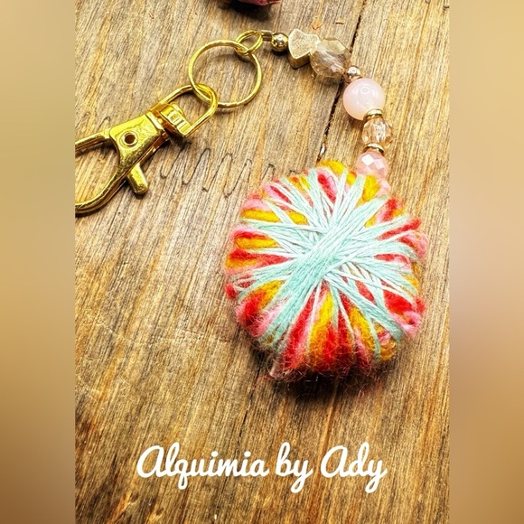 Add a pop of color to your accessories with this vibrant yarn ball keychain. Featuring a mix of red, pink, and yellow hues, it's perfect for adding a playful touch to your look.