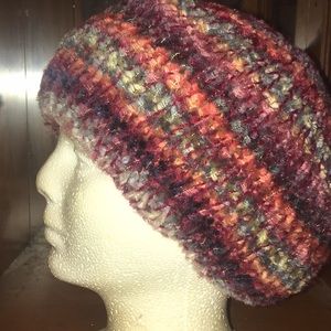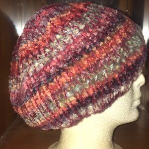This hat has multiple colors and is made with yarn (very soft) . This hat is also perfect for fall . Can fit any size head .