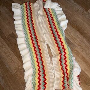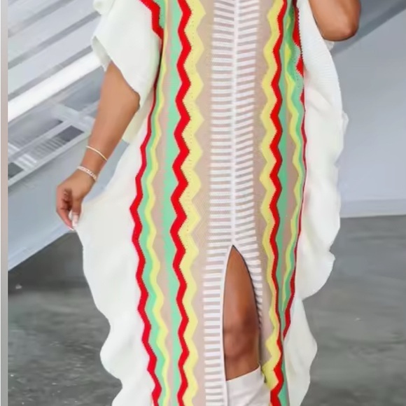Vibrant dress with zigzag patterns in red, yellow, and green. Features a stylish slit and flowing sleeves.
