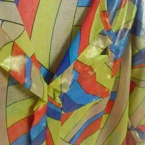 Like new condition. This top is stunning! Beautiful colorful Hi low top with roll tab sleeves. Top has a gold shimmer . Fabric is slightly sheer. Measurements are approximate :