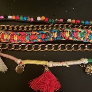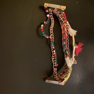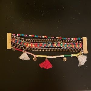 Bangle bracelet with various mediums. Threaded, pompoms, and gold chains. Magnetic clasp for easy accessorizing.
