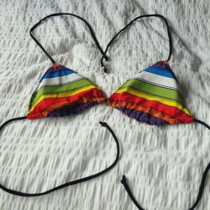 Reversible rainbow striped top. Halter ith tie around neck and back. Black strings with silver beads. Minor discoloration on the white stripe as pictured.