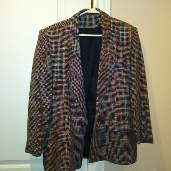 This black blazer has many multi colored checks. The colors are purple, turquoise and pink.