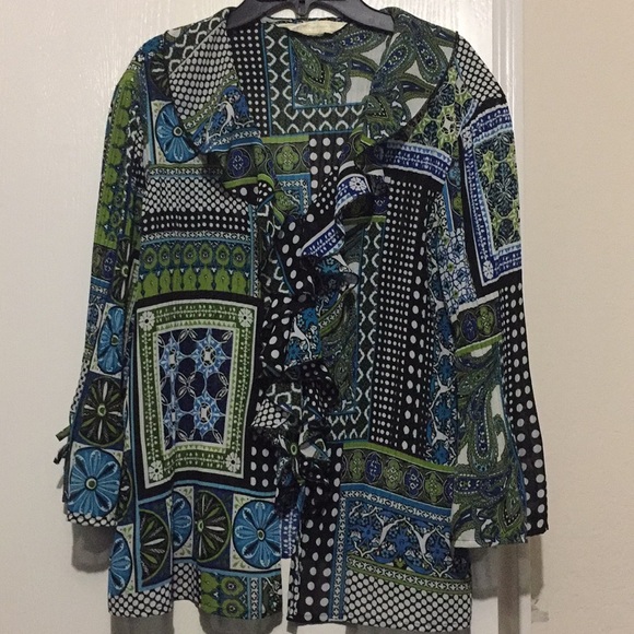 Sheer blouse with ruffles, perfect for work! Button down in front behind ruffles...can leave open and wear with an under shirt or button to wear closed.
