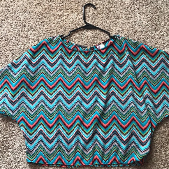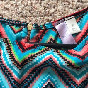 Turquoise, coral, green, and black blouse with zipper on the back. Very cute!
