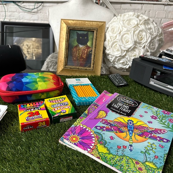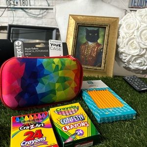 Pencil case two boxes of crayons to coloring books, semi used and a pack of pencils W1-8-23