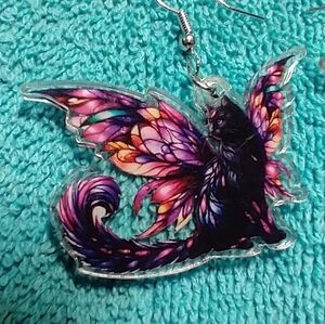 Colorful cat with angel wings black pink purple orange blue wire earrings gothic