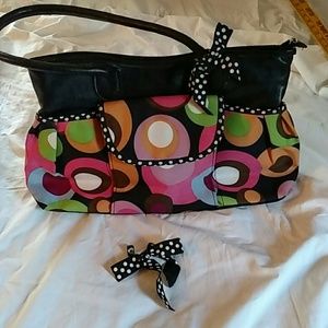 Colorful clean purse front pocket snaps, back pocket Velcro closure. Black and white snap on bows!!!! Slight wear on the straps.