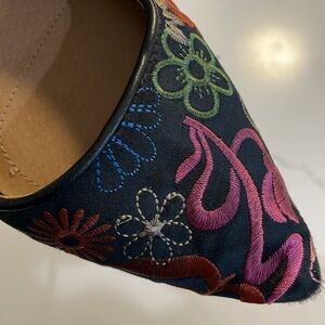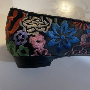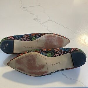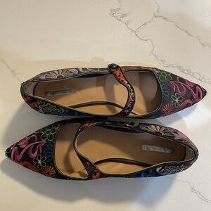 Tahari brand flats with 1” kitten heel. Unique floral embroidered pattern. Very colorful and beautiful! Mary Jane like strap across the top. Only worn twice with tights so the inside of the shoes are pristine.