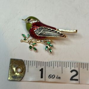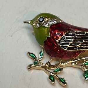 Colorful green and red enamel bird gold tone pin brooch statement jewelry
