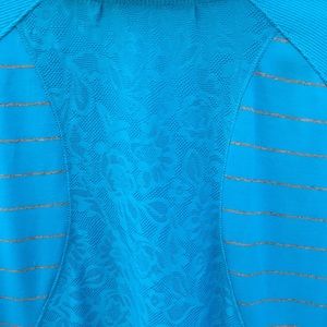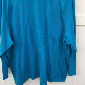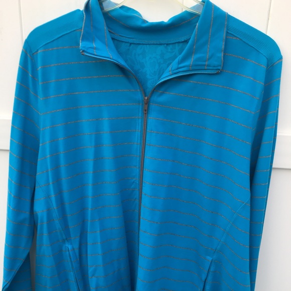 Lightweight colorful jacket with gray stripes all around and a lace mesh detail on the back