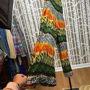 Colorful jungle leopard print high waist wide leg pants. Features flattering smooth front wide waistband with smocked elasticized back for comfort. Wide belt loops - did not come with a belt. The material is soft and lightweight. Gently worn with light signs of wear: a small area in the crotch that is unstitched in a few places but the seam is still sewn shut and some of the elastic thread in the back smocked area has come unsewn (see last 3 pics). See pics for measurements. These would look so fantastic with a simple black or white tank top and some sandals!