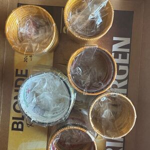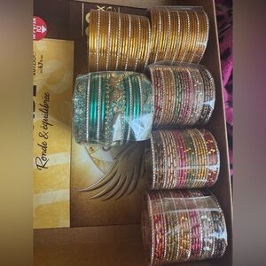 Vibrant bangle set featuring gold, green, red, and black designs. Perfect for adding a pop of color to any outfit.
