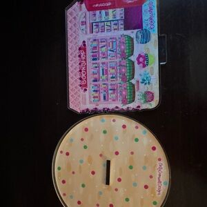 Vibrant bookshop themed standing display with polka dot base. Features pink, red, and multicolor accents.