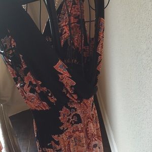 Perfect fall dress! Vibrant maxi dress with v-neck in front and back. Gorgeous print and perfectly pairs with a denim jacket for fall. Worn one time. Empire style waist with rouching for a flattering look. Polyester and spandex material. Machine washable