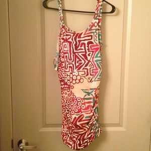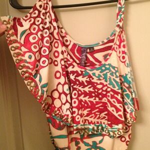 This dress is very cute. It's fitted and has one braided strap and one normal with a flowy piece in front that has embellishments. Just never could find the right shoes for it! But it is super cute on! Size medium but fits 4-6. And even 7-8. Very stretchy material.