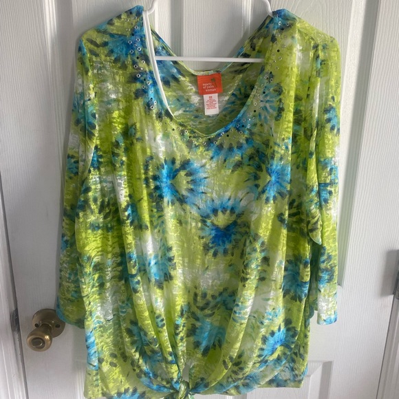 Colorful and cheery size 3x, 2-piece top with 3/4 length sleeves. Ties loosely at bottom of top. White tank top included to wear under this colorful top. Dress it up or wear with jeans or capris.