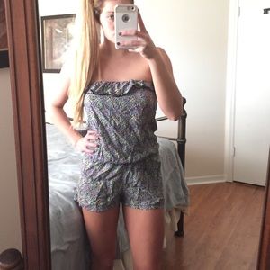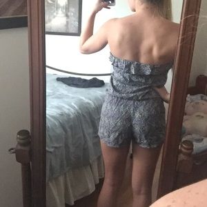 Ruffled top romper. Tag says Medium, but definitely fits like a small. Perfect for summer but I also wore it w a long cardigan and ankle boots.