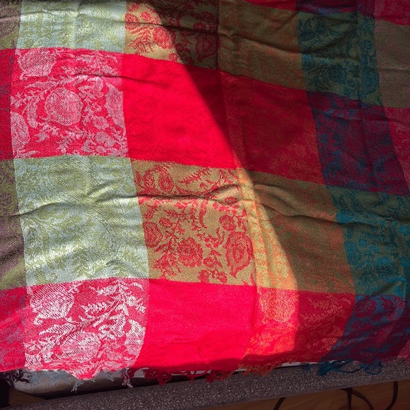 Scarf with multiple colors. 100% cashmere. Has designs of flowers on it.