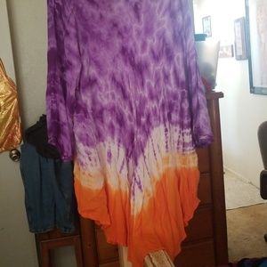 Orange, purple with white and designs, tie die look. Long shirt slightly longer in back.