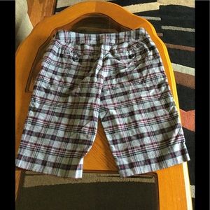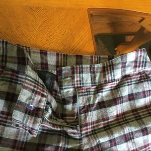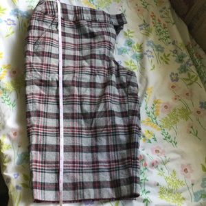 Excellent condition. It has two pockets at the back with buttons and two pockets an front. Zipper, button and hooks for closure. Measurement from waist to bottom seam 21.5 inches.