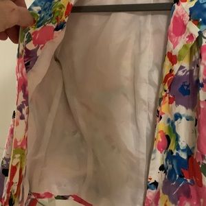 Ready for spring after the grayness of winter? This jacket is sure to cure any residual winter blues. It is buttonless, fully lined, has pockets, and is in excellent condition. It measures 18 inches pit to pit and is 21 inches long. The fabric is polished cotton.