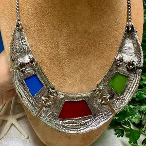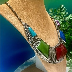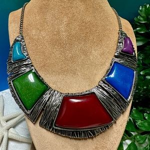 Colorful “sparkle” raised sectioned statement necklace in textured silver tone setting.