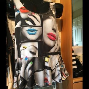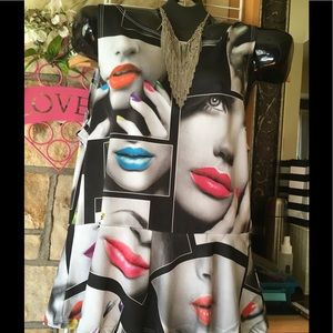 Fun top, especially if you love lipstick/makeup. Very colorful, size medium.