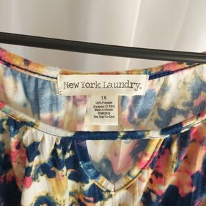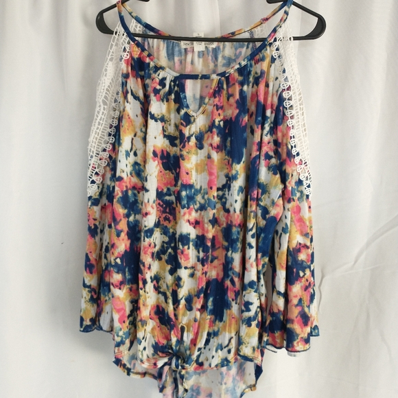 Colorful hi-low keyhole top, lace cutouts on sleeves and knotted in front. Smoke free, pet free home!