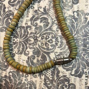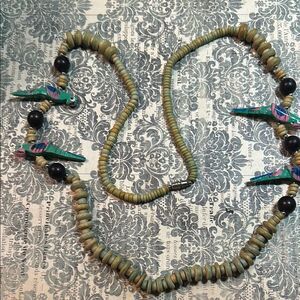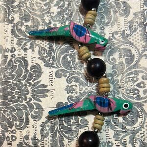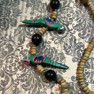 Unique necklace with colorful parrot beads and wooden accents. Features vibrant green, blue, and pink hues.approximately 15”. G178
