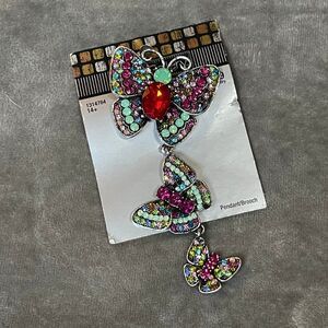 Add a touch of whimsy to your outfit with this colorful butterfly brooch. Featuring vibrant red, pink, green, and blue stones, this piece is perfect for any occasion.