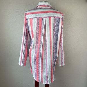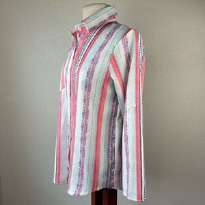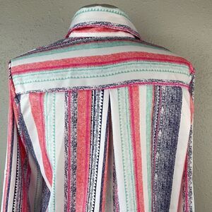 Great colors on this classic button down shirt in like new preowned condition. It measures 20 inches armpit to armpit laying flat and 28 inches in length from shoulder to hem.