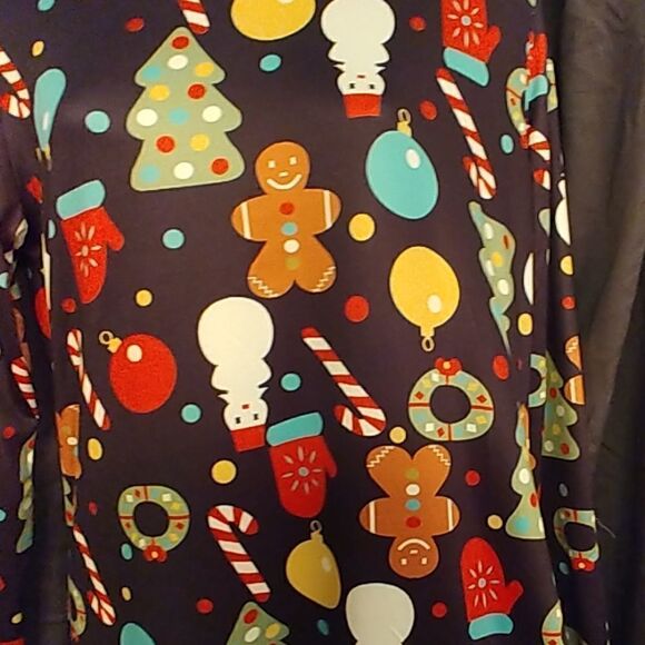 This long sleeved, a-line dress is perfect for holiday parties paired with tights and boots. Stretchy black polyester background with Christmas motifs including gingerbread men, candy canes, trees, snowmen, mittens, wreaths and ornaments. Measurements flat and unstretched: 19" pit to pit, 17" waist, 24" shoulder to cuff, 34" shoulder to hem. Good condition with no rips or stains. Some mild wear on fabric. Small pick on left shoulder. See pics.