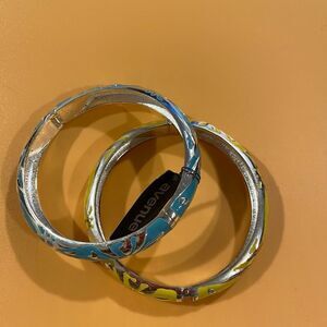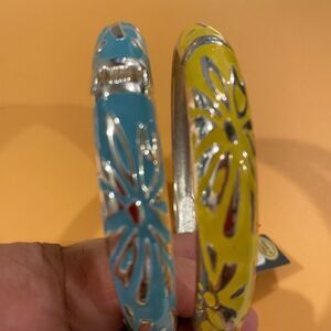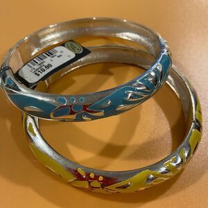 Vibrant enamel bangles with floral designs. Features blue and yellow colors with silver accents.