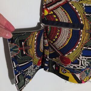 Vibrant shorts with a geometric pattern. Features a mix of colors including blue, yellow, and red. Stylish and eye-catching design.