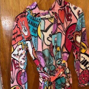 This is the perfect girl Emoji robe! Bright colorful robe full of comic POW! And Wows. Any little person will LOVE this .Size 7-8 with tie to close .Soft comfortable material with hood.Vibrant robe with a playful graphic print. Features a mix of pink, blue, yellow, and black colors.