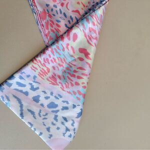 Vibrant scarf with a leopard print design. Features pink, blue, and yellow colors.