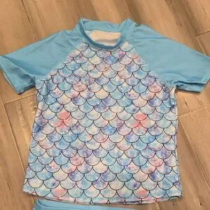 Make a splash with this colorful kids rashguard set, featuring a fun mermaid scale pattern. Ideal for sunny beach days.