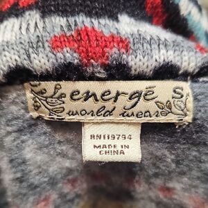 Vibrant open coat with a western/winter pattern. Features red, black, and white colors.