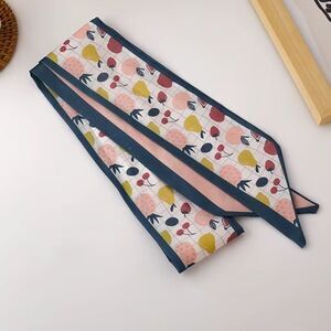Stylish scarf featuring a colorful pattern with a blue trim. Perfect for adding a pop of color to any outfit.