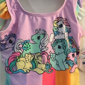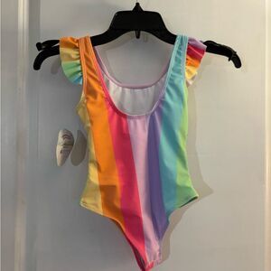 Adorable swimsuit with rainbow stripes and pony design. Features ruffled sleeves.