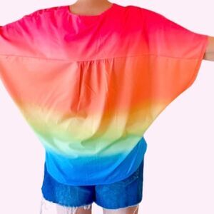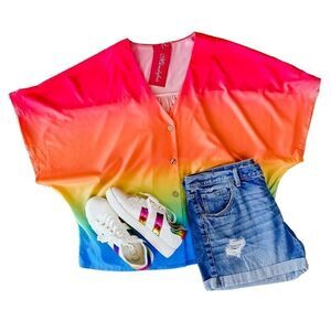 This light weight rainbow striped top is adorable paired with cutoffs and sneakers! Throw on a straw hat and you are ready for vacation! This breezy top is not sheer but is very light and breathable. Generous loose fit, button up front, v-neck. Boutique brand is true to size.