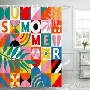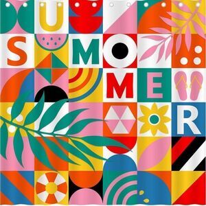 A vibrant shower curtain featuring a bold geometric design with a summer theme, perfect for adding a pop of color and a fun, summery vibe to any bathroom space.