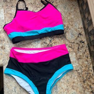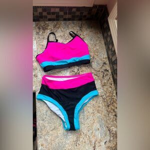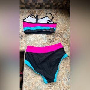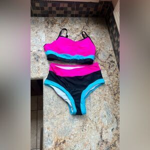 Vibrant women's bikini set featuring a striking combination of pink, blue, and black. Perfect for making a statement at the beach or pool. Pads in top. Worn once to surf.
