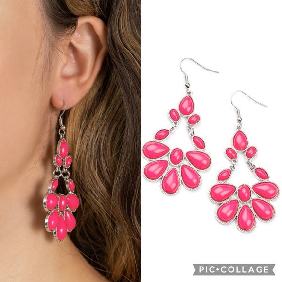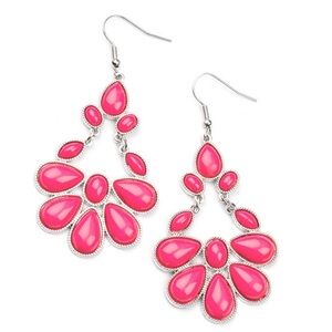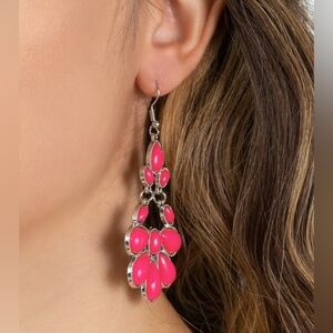 Detail ~ Encased in textured silver fittings, a mismatched collection of oval, marquise, and teardrop Fuchsia Fedora beads connect and link into a vivacious lure. Earring attaches to a standard fishhook fitting.