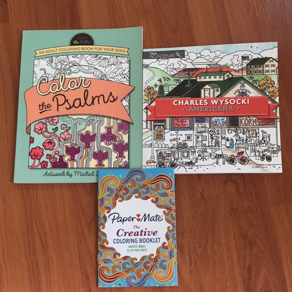 Set of three coloring books including 'Color the Psalms' and 'Charles Wysocki Americana'. Comes with a Paper Mate creative coloring booklet.💙