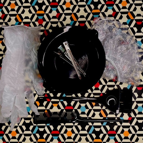This coloring kit helps you do hair coloring like a pro! Comes with coloring bowl, applicator brush, rat tail comb, 4 clips, 2 pairs of gloves and 1 plastic cap. Put color in the bowl, section hair into 4 sections (one down the center, two ear to ear across the top of the head. Apply with applicator brush along hairline first then work your way through each section for even distribution. Works perfect for root touch ups or all over color!