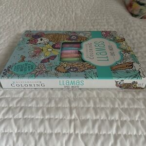 Colorful llama-themed coloring book with pastel markers. Features vibrant floral designs.