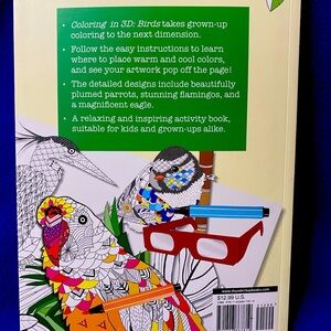 Coloring in 3D for kids and grownups. Take coloring to the next dimension. 3D glasses included. Birds include parrots, flamingos and an eagle, chickens and more.