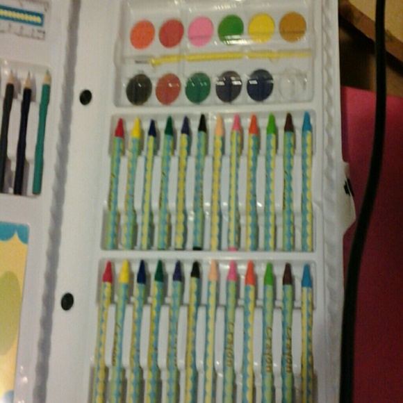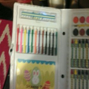 Whit it has a note book eraser,colored pencils,crayns,paint with paint brush